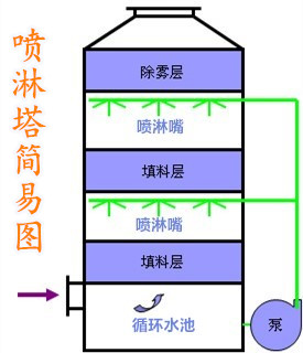 上圖一張廢氣處理流程圖,主要設備包括玻璃鋼離心風機、廢氣凈化塔以及管道、泵等配件。其中風機、管道、泵、加藥箱、循環水箱等配件是廢氣處理工程中所比不可少的設備,也是出了廢氣凈化塔之外的主要設備。而玻璃鋼酸霧凈化塔的結構,以下幾部分是必不可少的: