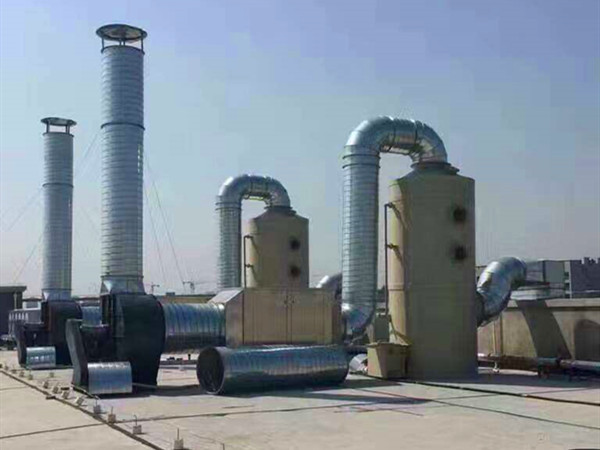 上圖中黑色的風機為防爆型玻璃鋼離心風機,廢氣處理塔的材質選擇的是pp材料,管道則使用的是碳鋼材料。