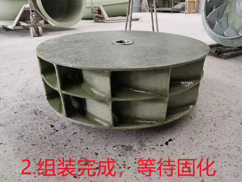 a、首先是將玻璃鋼風機葉輪需要的配件單獨制作出來,如葉片、底座、頂蓋、等。然后人工進行組裝,組裝工作完成之后再使用樹脂混合材料進行加固。