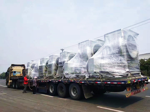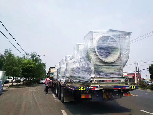 上個月山東某客戶在我司訂購的一批6臺14C75KW的玻璃鋼離心風機今天發(fā)貨,之所以交貨期多達一個月,主要是因為這一批風機使用的電動機為變頻防爆專用電機,電機需要進行定制。在發(fā)貨前使用透明塑料模對風機進行了整體的包裹。