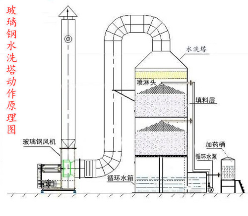 洗滌塔即將廢氣中的雜質清除,以煤炭燃燒廢氣處理為例,首先,廢氣有管道進入塔體底部,與由上至下的噴淋液體進行充分接觸,將廢氣中含有的灰塵過濾掉,流入底部的水槽內,氣體繼續往上走,根據廢氣量的大小選擇處理的次數,經過隔離層與形成膜狀的液體繼續清洗,如此反復,直至進入塔體頂部的除霧層,將氣體中含有的水分過濾之后,有管道經由玻璃鋼離心式風機排出。